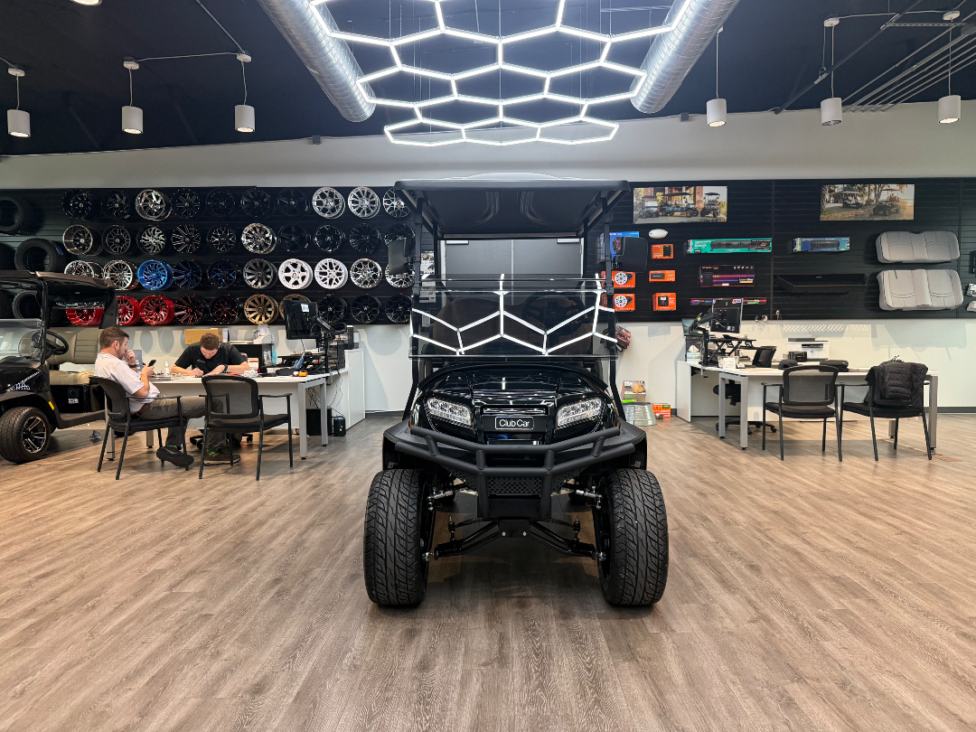 This 4-passenger golf cart features a robust 29 hp peak motor, an impressive 3.1 kWh Lithium-Ion battery, and highlights like LED lighting and a factory lift kit for enhanced performance.